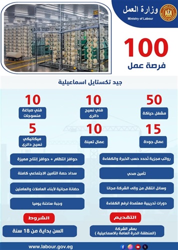 تنفيذًا لتوجيهات معالي وزير العمل محمد جبران، بتكثيف جهود الوزارة لتوفير فرص عمل لائقة للشباب وتعزيز التعاون مع مؤسسات القطاع الخاص، تُعلن وزارة العمل عن توافر 100 فرصة عمل جديدة بإحدى شركات الغزل والنسيج داخل المنطقة الحرة العامة بالإسماعيلية «200 فدان»، وذلك بالتنسيق مع شركة جيد تكستايل الإسماعيلية. وتشمل الوظائف المتاحة عددًا من التخصصات الفنية والعمالية، بواقع 50 مشغل حياكة، و10 فني نسيج دائري، و10 فني صباغة منسوجات، و5 ميكانيكي نسيج دائري، و15 عامل جودة، و10 عمال تعبئة، مع توفير رواتب مجزية تُحدد وفقًا للخبرة والكفاءة وبما يراعي تطبيق الحد الأدنى للأجور، إلى جانب حوافز انتظام وحوافز إنتاج مجزية.