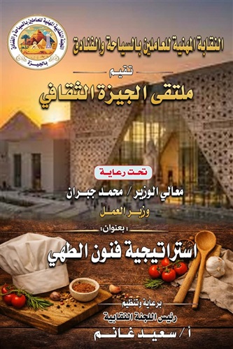 تعقد النقابه المهنية للعاملين بالسياحة والفنادق بمحافظة الجيزة برئاسه الاستاذ سعيد غانم ، بالتعاون مع مركز تدريب وتطوير وابتكار الطهى ، الملتقى التدريبى الأول الأربعاء 28 يناير تحت رعايه وزير العمل محمد جبران وبالتنسيق مع المستشار كريم أبو السعود وكيل الوزارة بمديريه عمل الجيزة ، وحضور رفيع المستوى من السادة رؤساء ونواب اللجان النقابية .