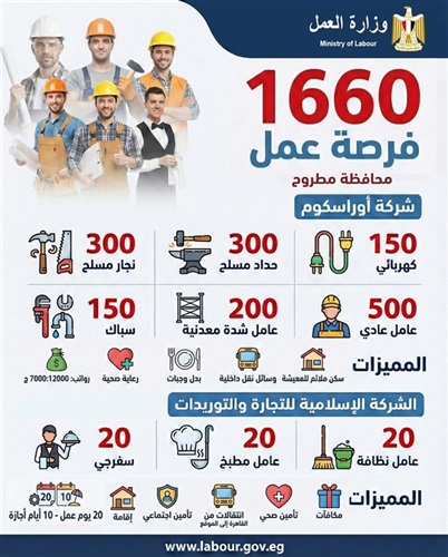1660 فرصة عمل جديدة بالتعاون مع مديرية عمل مطروح وشركتي أوراسكوم والإسلامية للتجارة والتوريدات