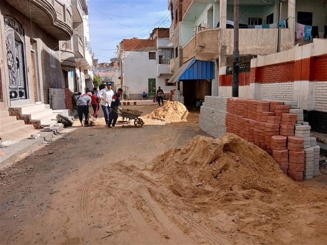 متابعة أعمال تركيب بلاط الإنترلوك بمدخل مجمع مدارس قرية منية السلامة بالرحمانية
