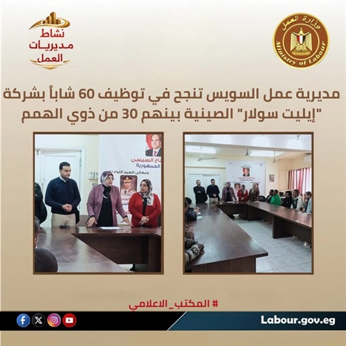 6-مديرية عمل السويس تنجح في توظيف 60 شاباً بشركة "إيليت سولار" الصينية بينهم 30 من ذوي الهمم