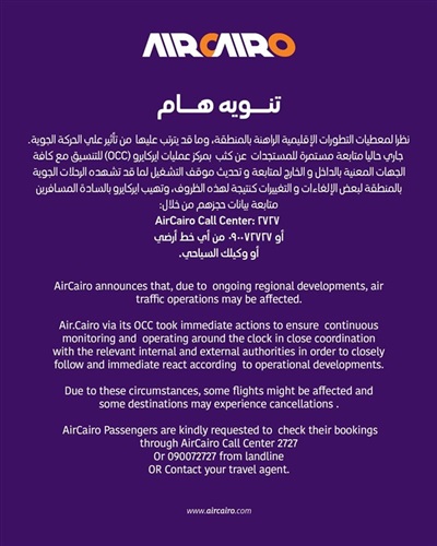 نظراً لمعطيات التطورات الإقليمية الراهنة في المنطقة.. إير كايرو تُصدر تنويهاً هاماً لعملائها