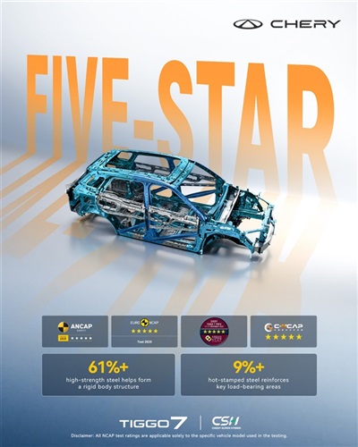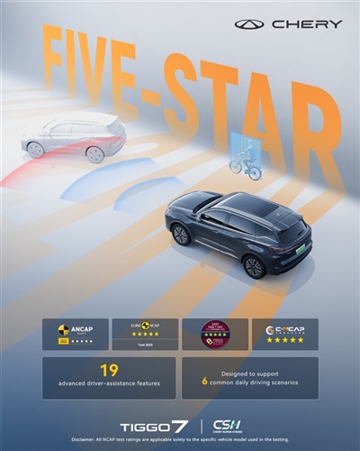 مؤخرًا، نجحت TIGGO7 في حصد أعلى تصنيف للسلامة بخمس نجوم من ثلاث جهات دولية كبرى هي Euro NCAP، وANCAP، وASEAN NCAP. وبانضمام هذا الإنجاز إلى شهادة الخمس نجوم التي حصلت عليها سابقًا من C-NCAP، تصبح TIGGO7 السيارة الوحيدة من علامة صينية التي تنجح في تحقيق أعلى تقييم عبر أنظمة تقييم السلامة الأربعة الرئيسية في العالم.