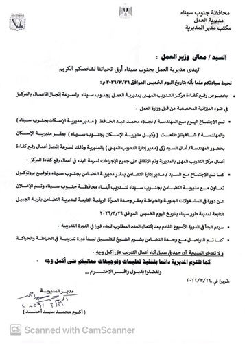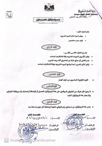 وفي سياق متصل شهدت المديرية خطوة جديدة لتعزيز التعاون بين مؤسسات الدولة حيث التقى مدير مديرية العمل مع مدير مديرية التضامن الاجتماعي وتم توقيع بروتوكول تعاون مشترك يستهدف تدريب أبناء محافظة جنوب سيناء وتنمية مهاراتهم الحرفية والمهنية