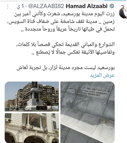 وأشار الزعابي إلى أن بورسعيد نجحت في أن تمزج بين عبق الماضي وروح الحاضر، حيث يلتقي الميناء بالحياة اليومية، وتتناغم الشواطئ مع التاريخ، في لوحة متكاملة تعكس خصوصية هذه المدينة الساحلية المميزة.