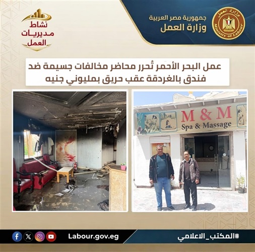 تنفيذًا لتوجيهات وزير العمل حسن رداد، وجه أحمد جابر، مدير مديرية عمل البحر الأحمر، لجنة الأزمات بمعاينة موقع حريق بفندق "ميراج باي"، وقررت المديرية تحرير محاضر مخالفات جسيمة فورية لقصور المنشأة في تطبيق اشتراطات السلامة والصحة المهنية.